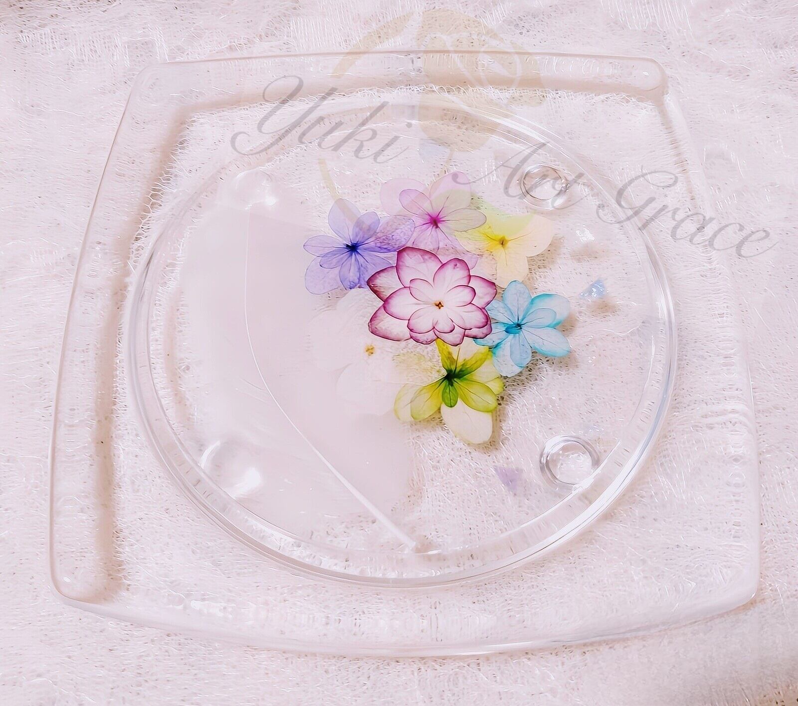 ハーバリウムコースター(紫陽花・レインボー)になります。